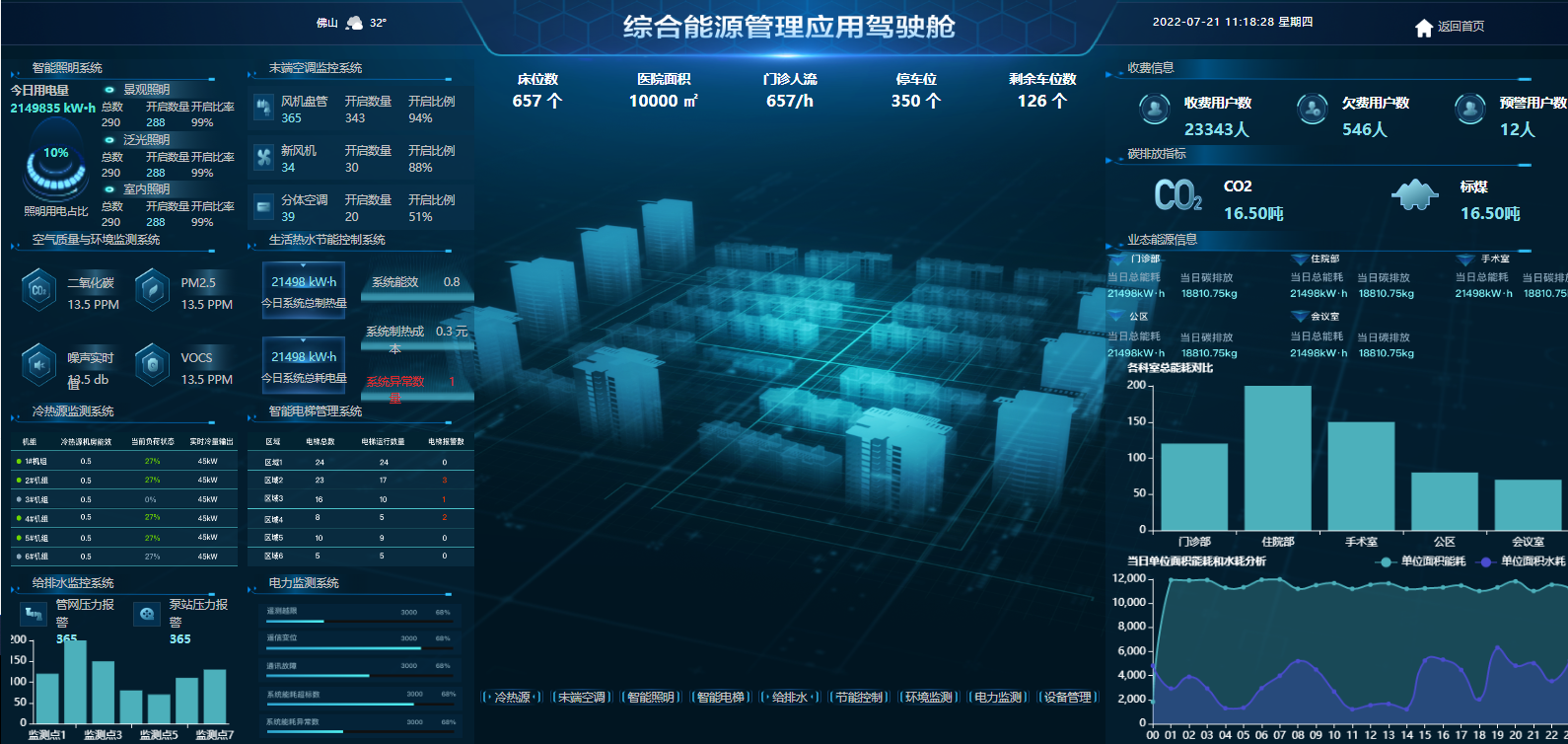 在監(jiān)控中心,人員可以通過(guò)直觀(guān)了解醫(yī)院內(nèi)各區(qū)域用能情況、設(shè)備運(yùn)行情況等實(shí)時(shí)信息,據(jù)平臺(tái)數(shù)據(jù)匯總,改造后三個(gè)月僅醫(yī)院空調(diào)系統(tǒng)累計(jì)節(jié)約電費(fèi)達(dá)28.9萬(wàn)元,顯著的節(jié)能降耗效果得到了參觀(guān)領(lǐng)導(dǎo)嘉賓的認(rèn)可。