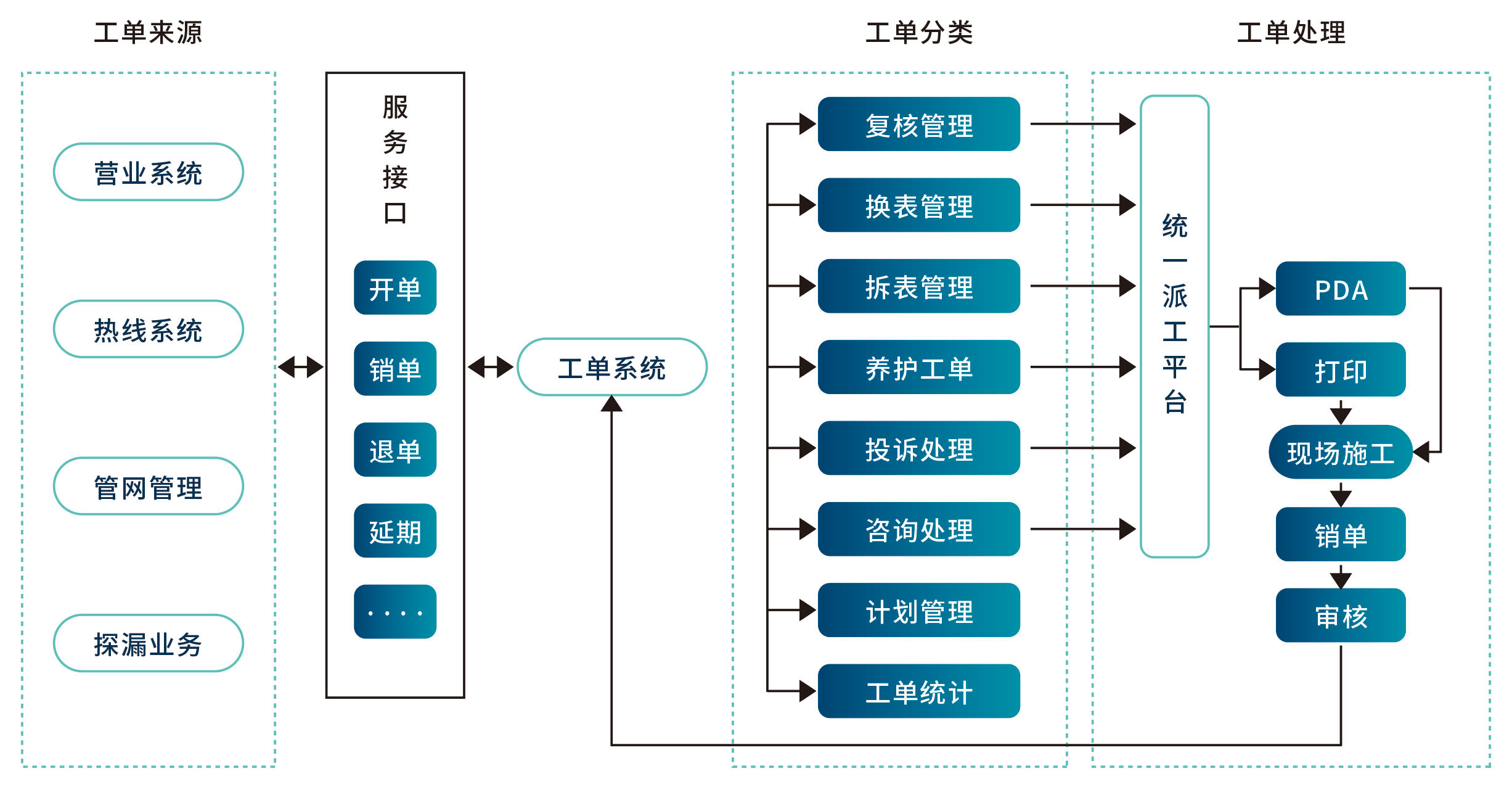 外業(yè)工單管理系統(tǒng)作為一套整合工作平臺,提供對涉及工單的業(yè)務(wù)流程的接入、展示和管理。將水務(wù)系統(tǒng)中各類工單按照預(yù)先設(shè)置的流程進(jìn)行流轉(zhuǎn),管理員可以看到整個工單的節(jié)點時間、內(nèi)容、經(jīng)辦人、流程等信息,提高管理透明度,該流程亦可成為解決爭端的證據(jù)或人員考核指標(biāo)。當(dāng)前流程人員也可根據(jù)流程安排進(jìn)行工作,減少人為判斷的情況,將工單處理流程信息化 、標(biāo)準(zhǔn)化。