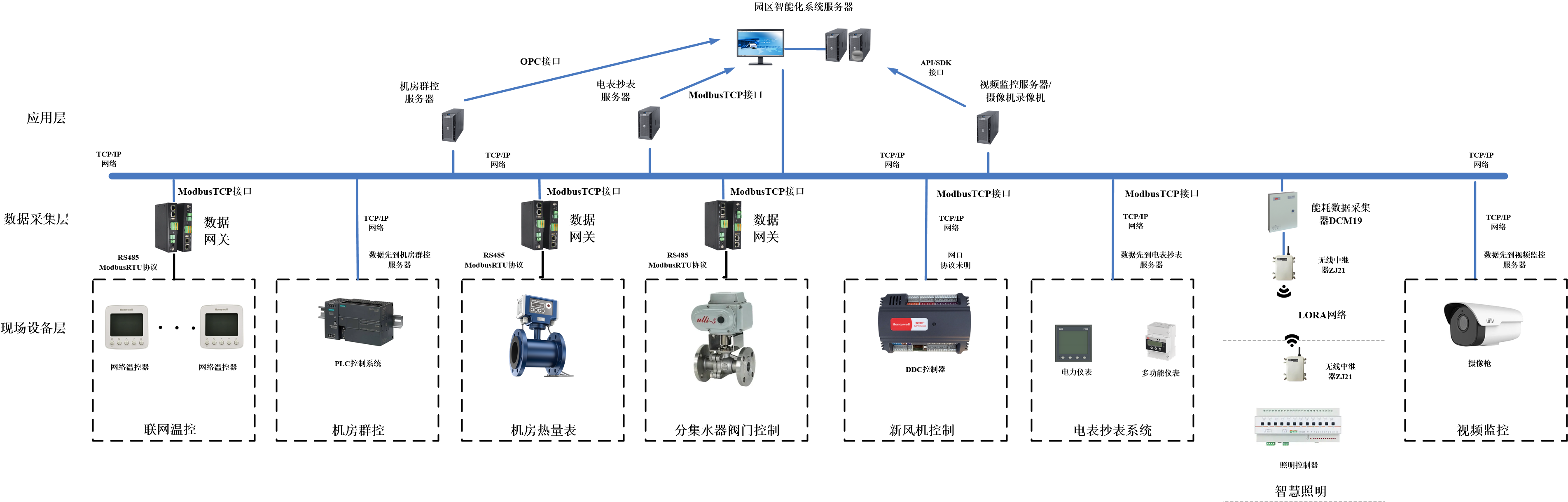 通過(guò)艾科能耗數(shù)據(jù)采集器,智能采集計(jì)量檢定生產(chǎn)樓、計(jì)量檢定實(shí)驗(yàn)樓的聯(lián)網(wǎng)溫控器數(shù)據(jù)與機(jī)房的電磁熱量表數(shù)據(jù),上行接入園區(qū)智能化內(nèi)網(wǎng),上傳至園區(qū)綜合智慧能源管理平臺(tái)