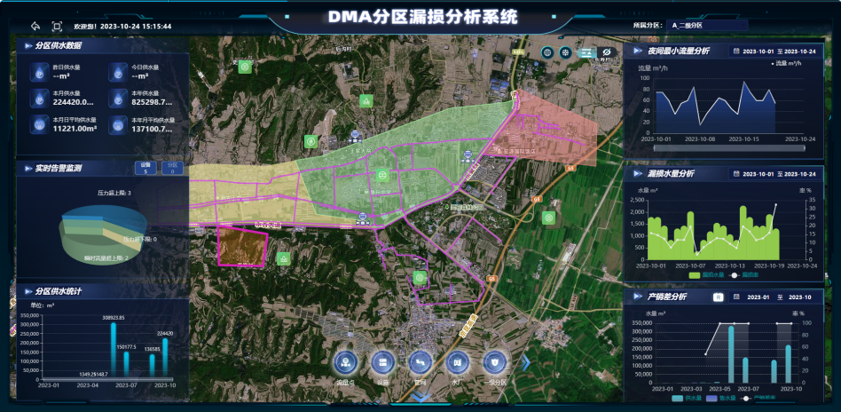 02、DMA分區(qū)漏損分析:展示預(yù)設(shè)的DMA分區(qū)基礎(chǔ)數(shù)據(jù),結(jié)合營(yíng)收系統(tǒng)的產(chǎn)銷數(shù)據(jù),并通過特定的漏損算法分析,直觀展示DMA分區(qū)漏損情況,為水司工作人員提供數(shù)據(jù)分析支撐,優(yōu)化產(chǎn)銷差率。